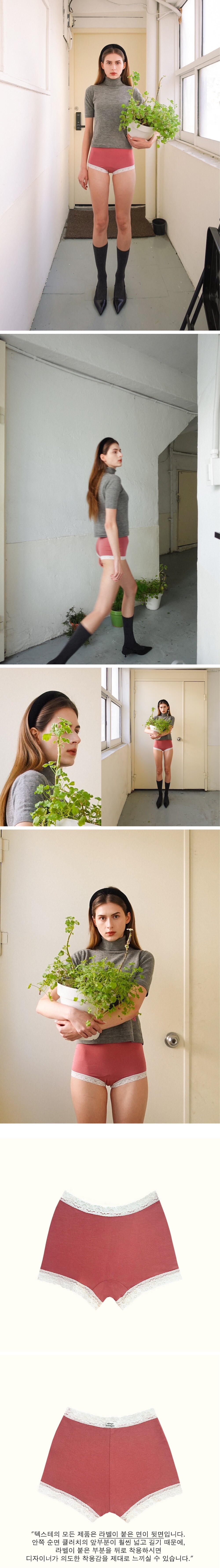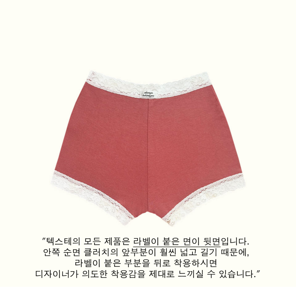 박서 브리프 라인은 허리까지 허리선을 올려 복부의 안정감을 더했으며, 앞부분은 사타구니 바로 아래부분을 일직선으로 감싸는 박서 형태의 디자인입니다.아랫쪽 클러치 부분은 순면 40수 실켓 원단으로, 시중의 다른 제품보다 긴 원단을 덧대었습니다.박서브리프는 다른 제품보다 코튼 클러치 면적이 크기 때문에, 착용시 레이스 밖으로 순면 클러치 부분이 자연스럽게 보이게 하기 위하여 순면 클러치는 누디 색상으로 통일하였습니다.