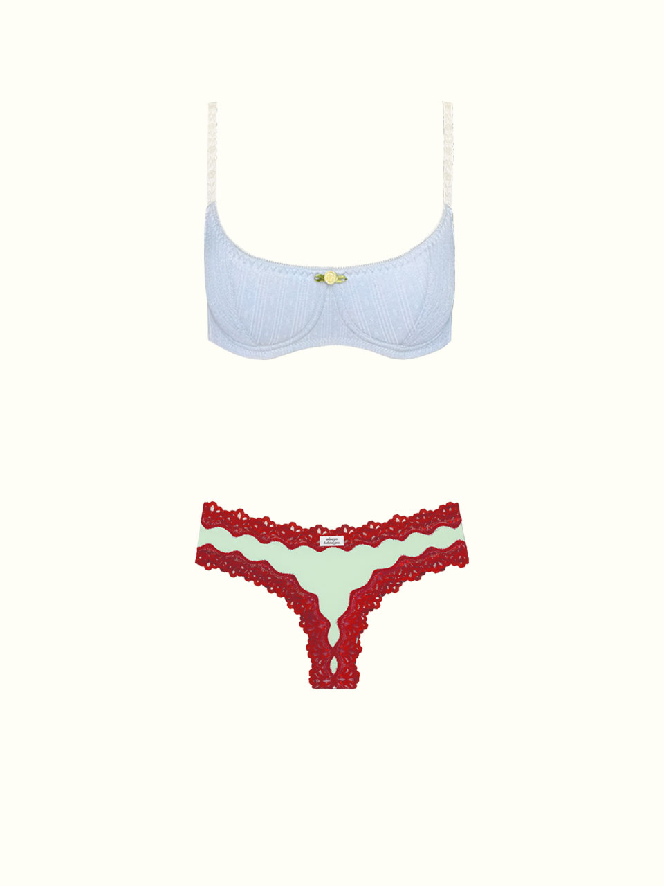 아일렛 브라는 세심한 디자인과 정교한 패턴 설계를 바탕으로, 노와이어 구조임에도 안정적인 지지력을 제공합니다.가슴 하변에는 안감 원단을 이중으로 덧대어, 가슴 모양이 퍼지지 않도록 보완하였으며,내장된 스펀지 패드는 홑겹 브라렛처럼 부드러운 착용감을 구현하는 동시에BP점(브래지어 포인트) 노출을 완화하고 형태를 안정적으로 유지해 줍니다.노스탤지어를 자극하는 자카드 어깨끈과 전통 브라의 훅앤아이 디테일도 특징입니다.후크는 실로 고정하여 자연스러운 마감을 더했고, 안쪽에는 부드러운 원단을 덧대어 촉감적인 편안함을 높였습니다.사이즈별 편차를 반영하여 유연하게 그려낸 U자형 등라인은 옆선을 안정적으로 감싸며,4단계 훅앤아이로 다양한 체형에 맞는 커버리지를 제공합니다.전체 실루엣은 투박하지 않고 정제되어,아일렛 브라가 지닌 정서—고전성과 세심함, 그리고 순수함—을 조화롭게 담아냅니다.