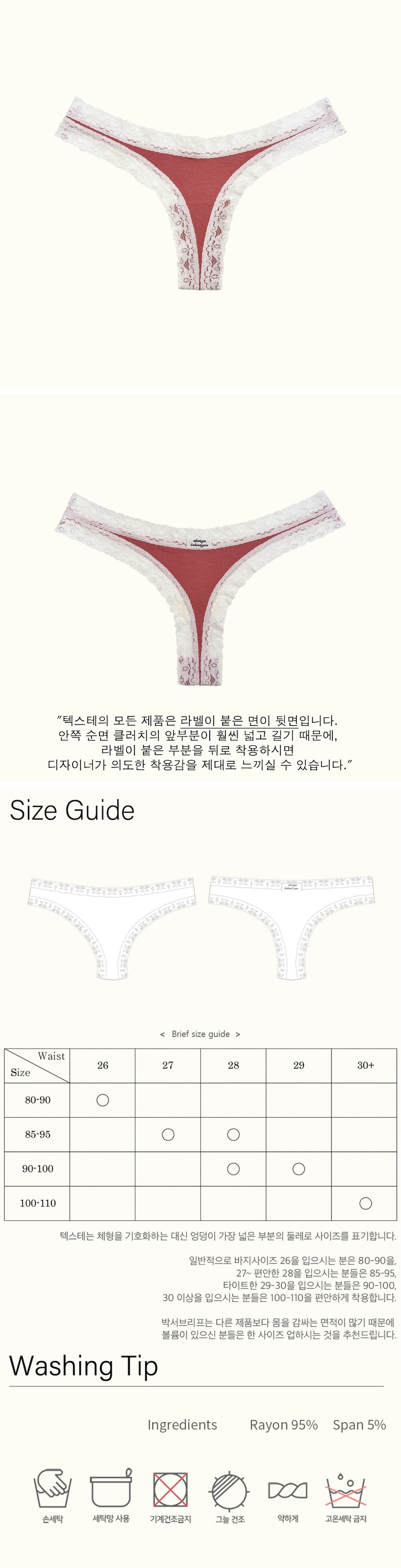 텍스테의 모든 제품은 기존의 티팬티나 치키팬티와는 달리 순면 40수의 원단을 국내 팬티라이너가 붙을 만큼 넓고 길게 덧대어 여성의 부담감을 최소화하였으며, 고무줄 밴드 대신 레이스와 봉제법을 사용하여 치골 쓸림이 없으며 팬티 라인이 드러나지 않습니다. 텍스테는 모든 여성이 자기 체형의 아름다움을 발견하기를 응원합니다.