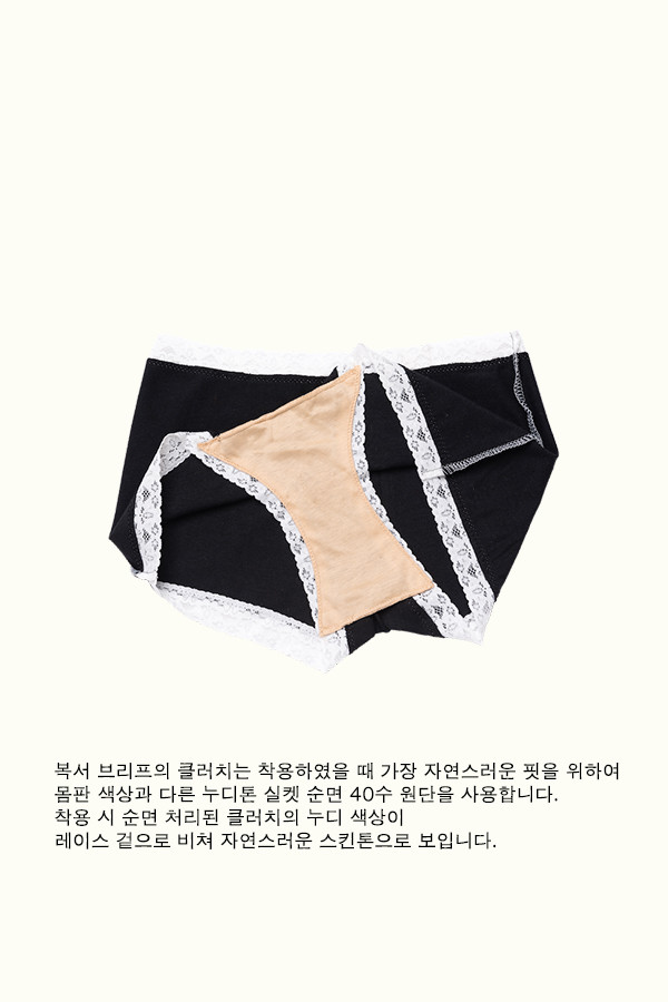 심플 이즈 뷰티 시리즈는 순면 원단과 과하지 않은 레이스를 사용하여 곡진 몸 위에 새로운 곡선을 그려냄으로써 아름다움을 만들어냅니다. 박서 브리프 라인은 허리까지 허리선을 올려 복부의 안정감을 더했으며, 앞부분은 사타구니 바로 아래부분을 일직선으로 감싸는 박서 형태의 디자인입니다.아랫쪽 클러치 부분은 순면 40수 실켓 원단으로, 시중의 다른 제품보다 긴 원단을 덧대었습니다.박서브리프는 다른 제품보다 코튼 클러치 면적이 크기 때문에, 착용시 레이스 밖으로 순면 클러치 부분이 자연스럽게 보이게 하기 위하여 순면 클러치는 누디 색상으로 통일하였습니다.