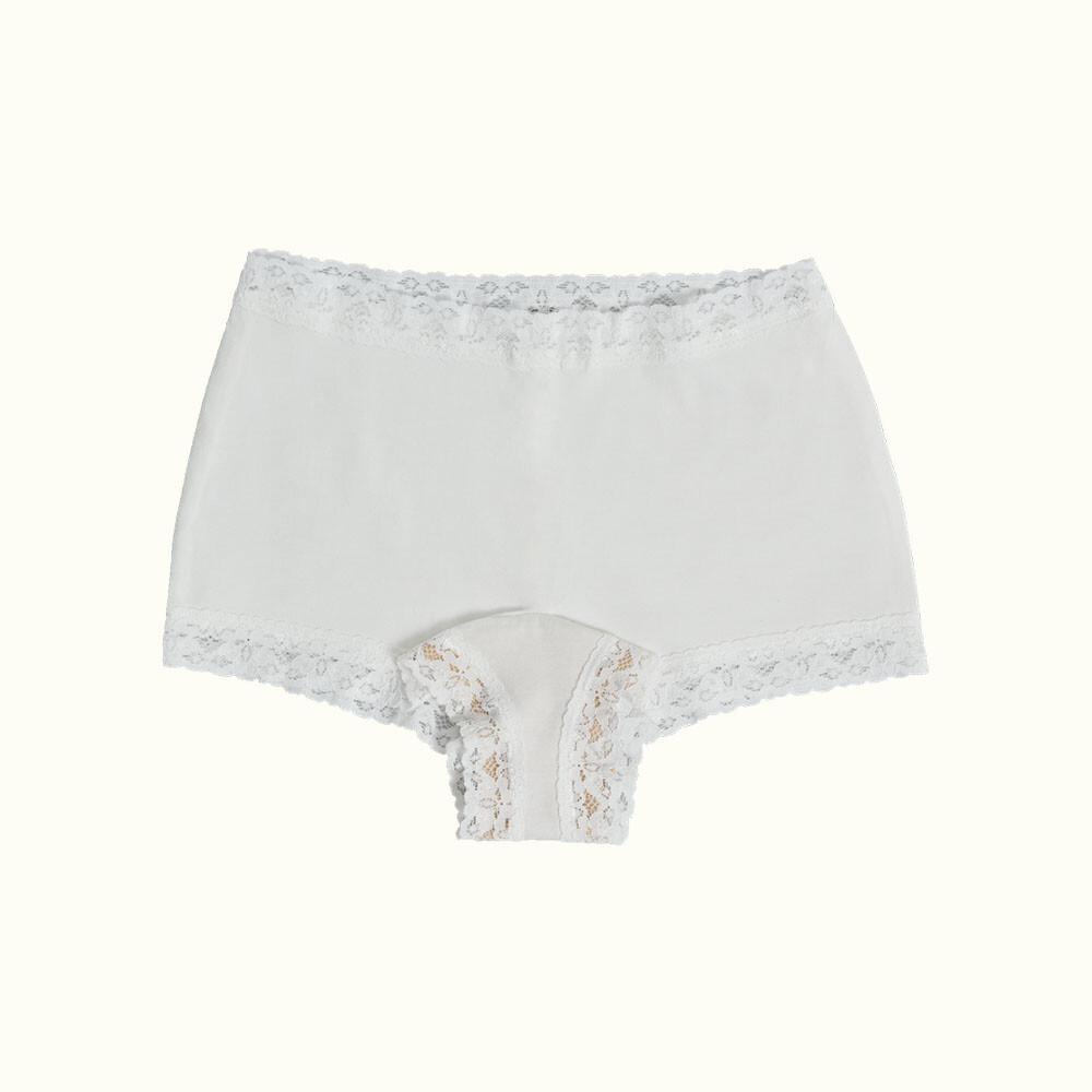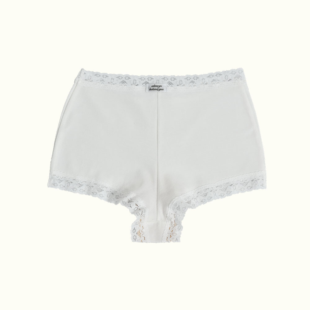 몸판 순면 원단의 코지한 아이보리 컬러와, 허리 다리 부분을 감싸는 레이스의 아이보리컬러에 약간의 베리에이션을 통하여 보다 빈티지하고 지루하지 않습니다.